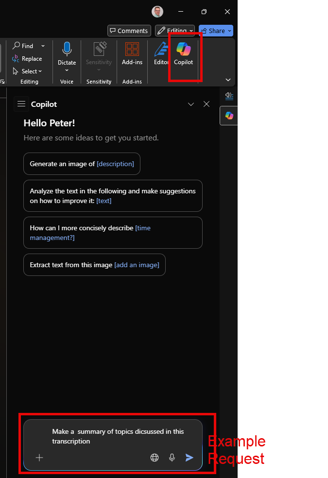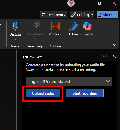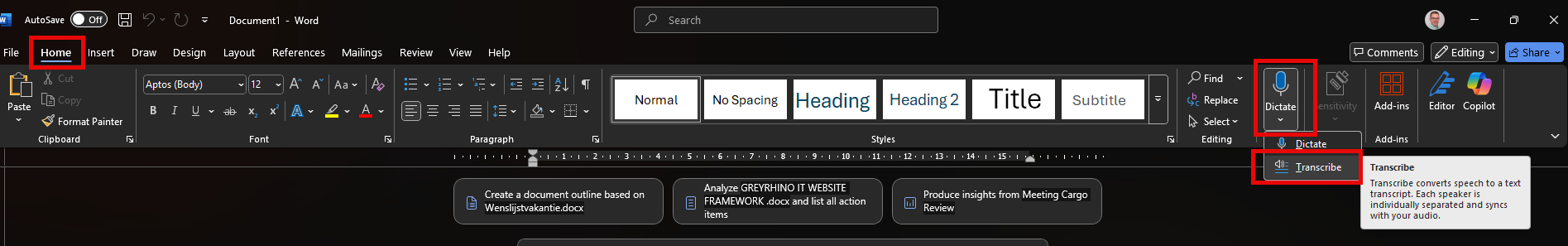 - In the ribbon menu , as depicted below, go to Dictate -> Transcribe: