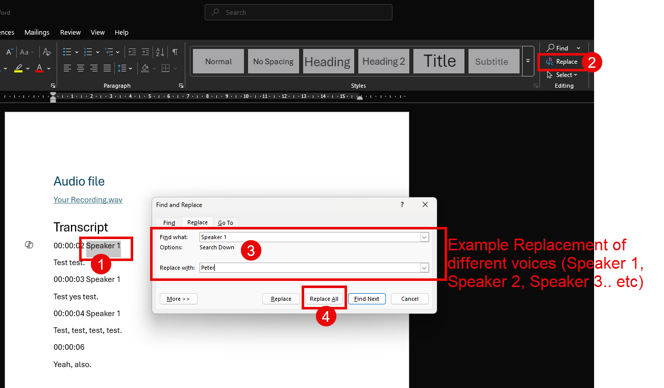 Additionally, you can in the Word text replace 'Speaker 1' etc with the real person names (i.e. Peter) as seen below: