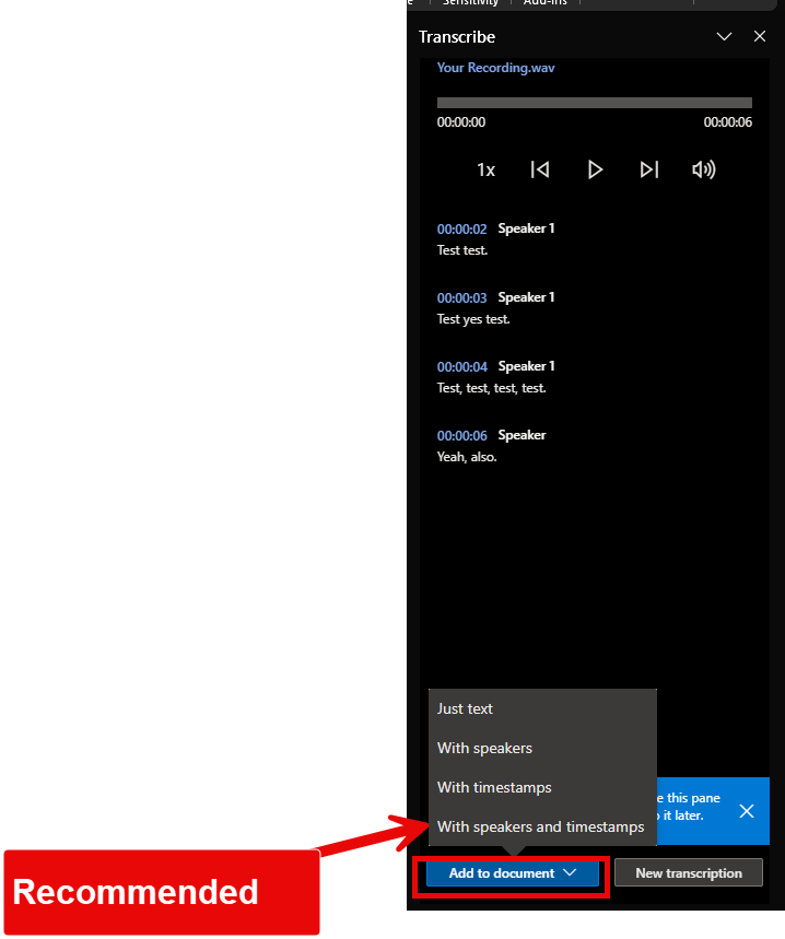 You can now Press the add the transcription into the document, see below on the recommended settings